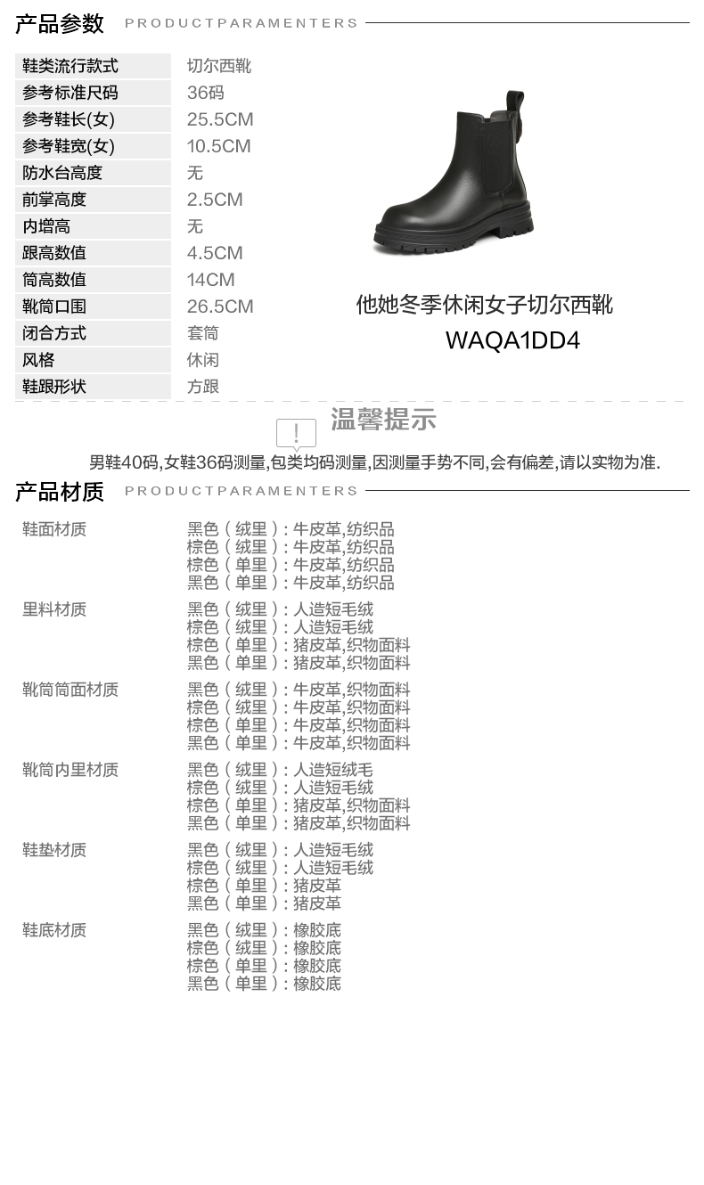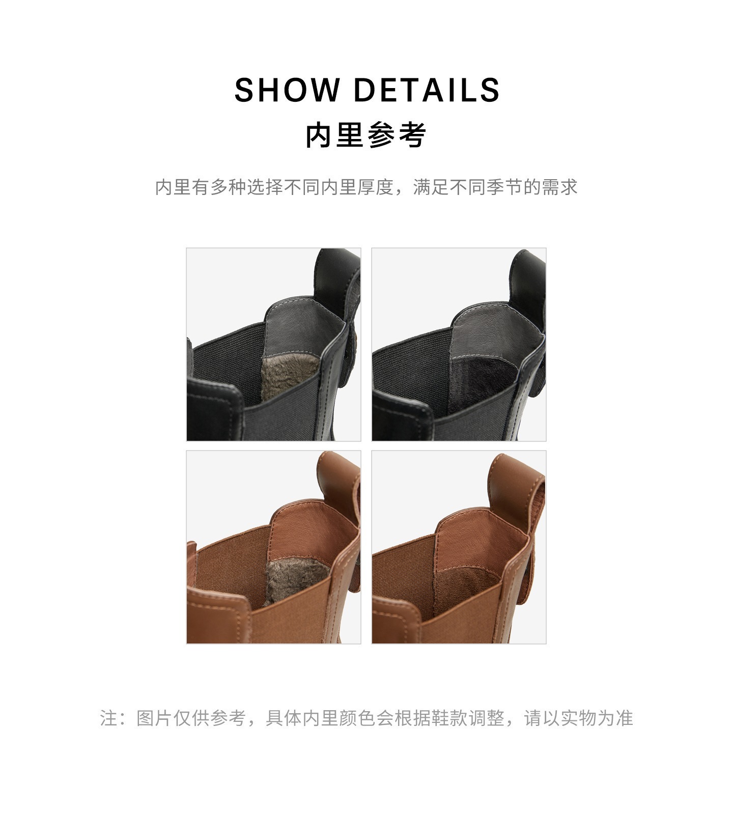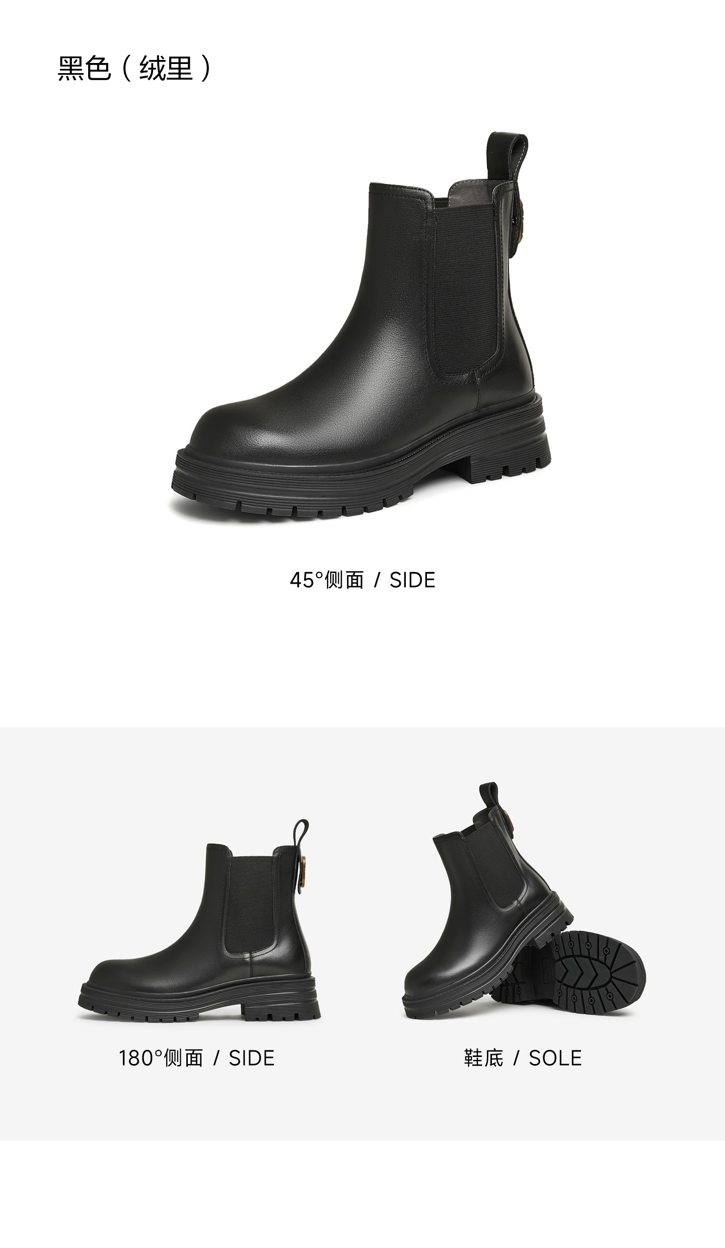 | 帮面材质:牛皮革织物 | 配跟:有 | 靴筒口围:26.5CM | 上市时间:2024年冬季 | 鞋类流行款式:切尔西靴 |