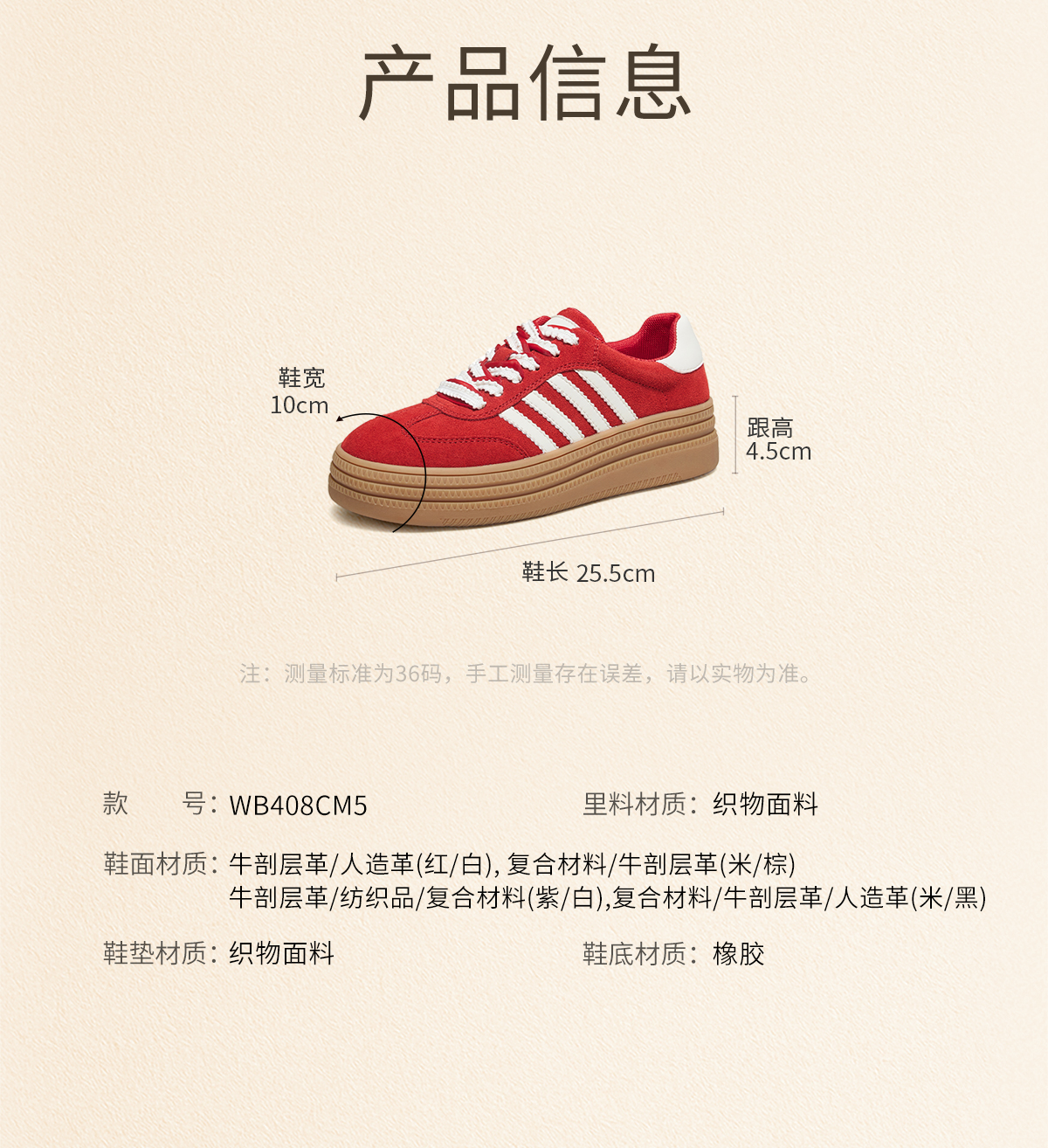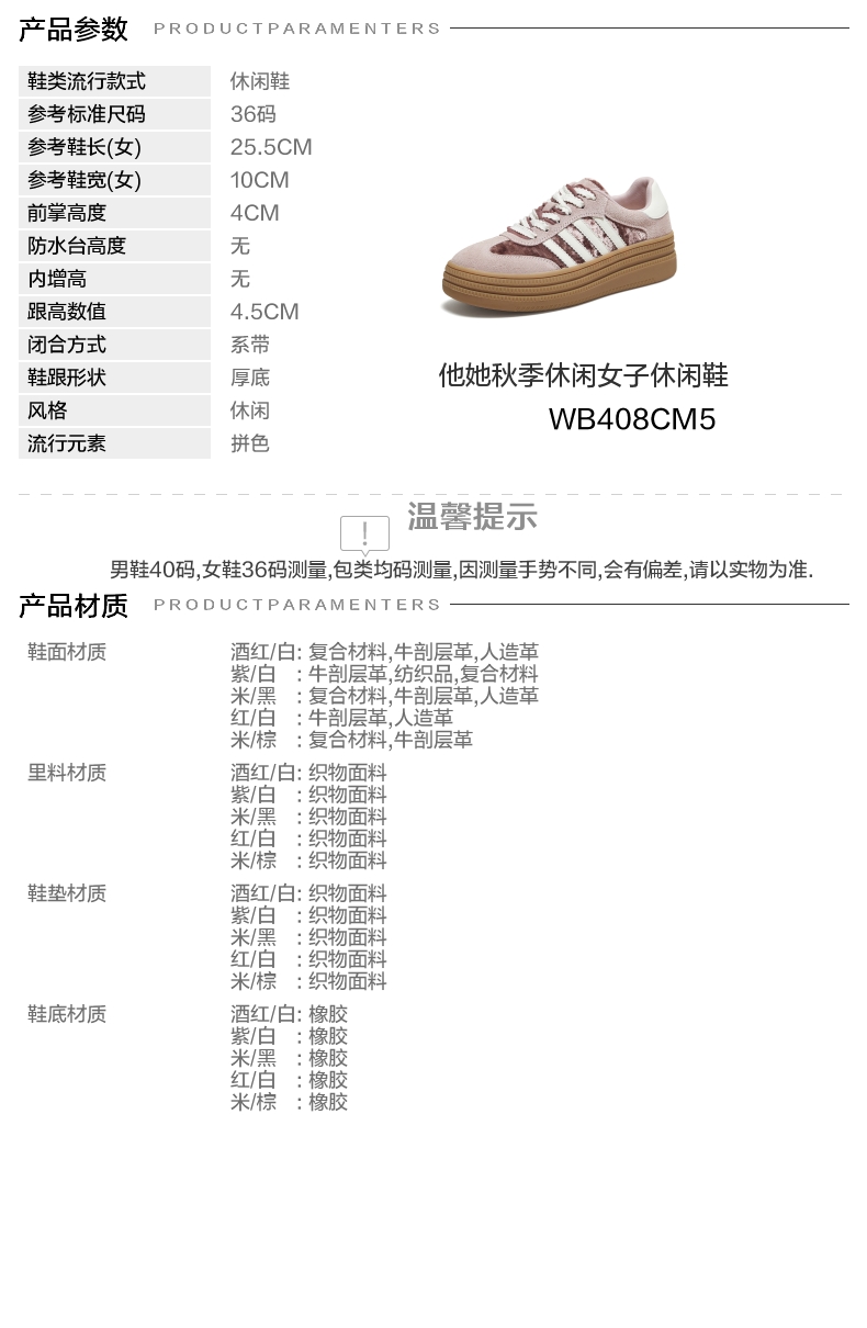 | 鞋跟形状:厚底 | 参考鞋长(女):25.5CM | 流行元素:拼色 | 参考鞋宽(女):10CM | 风格:休闲 |