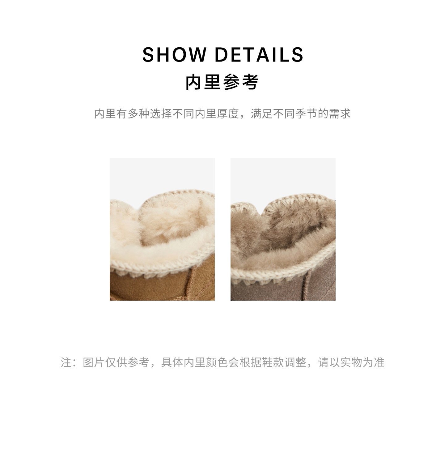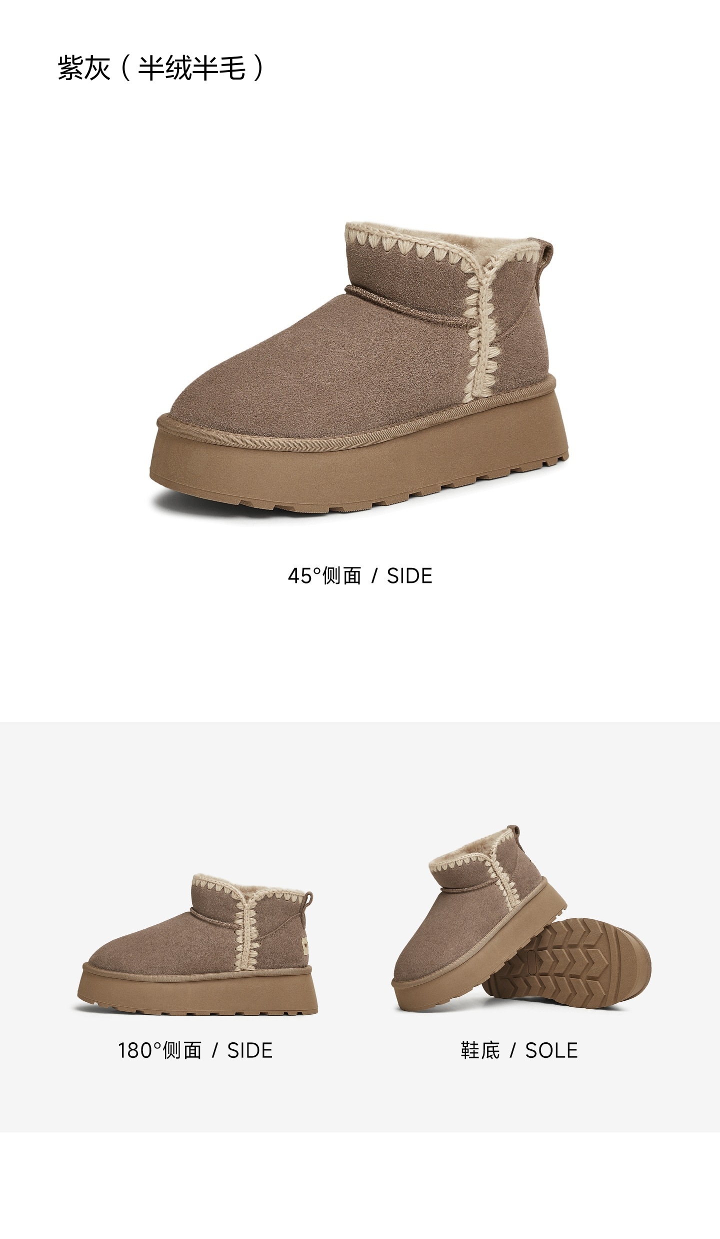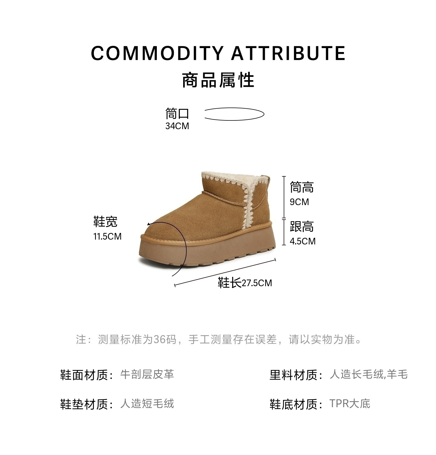 鞋底材质:TPR大底 靴筒内里材质:羊毛人造长毛绒 内增高:无 鞋面材质:牛剖层皮革 闭合方式:套筒