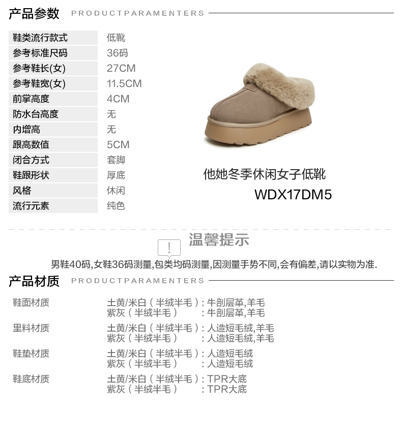 | 鞋帮:低帮 | 鞋底材质:TPR大底 | 内增高:无 | 鞋面材质:羊毛牛剖层革 | 闭合方式:套脚 |