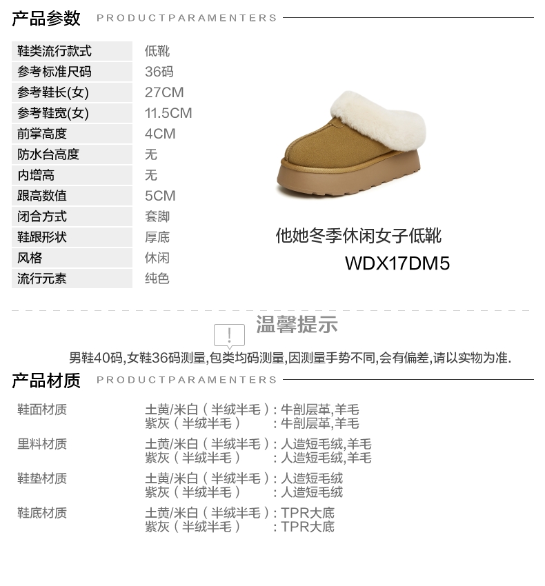 | 鞋帮:低帮 | 鞋底材质:TPR大底 | 内增高:无 | 鞋面材质:羊毛牛剖层革 | 闭合方式:套脚 |