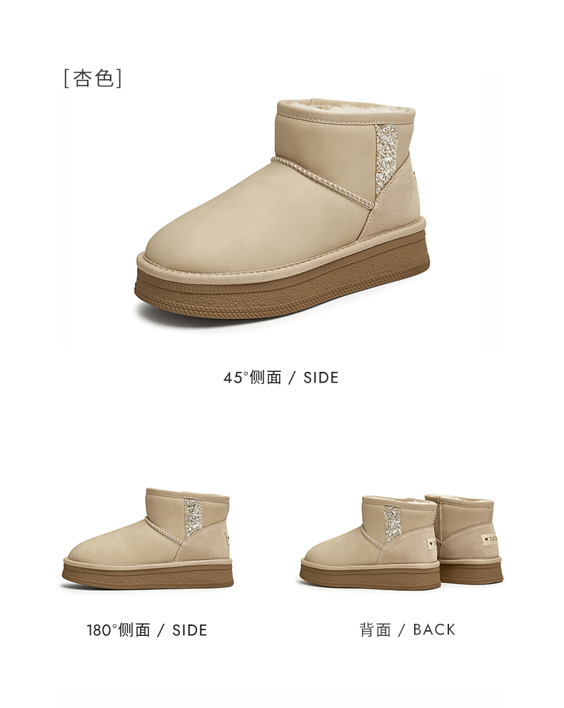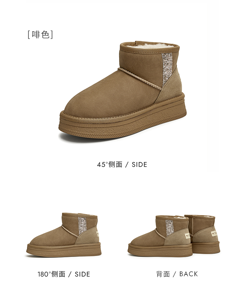 | 性别:女子 | 靴筒筒面材质:牛剖层革复合材料织物面料 | 里料材质:人造短毛绒 | 制鞋工艺:胶贴皮鞋 | 款式季节:冬季 |