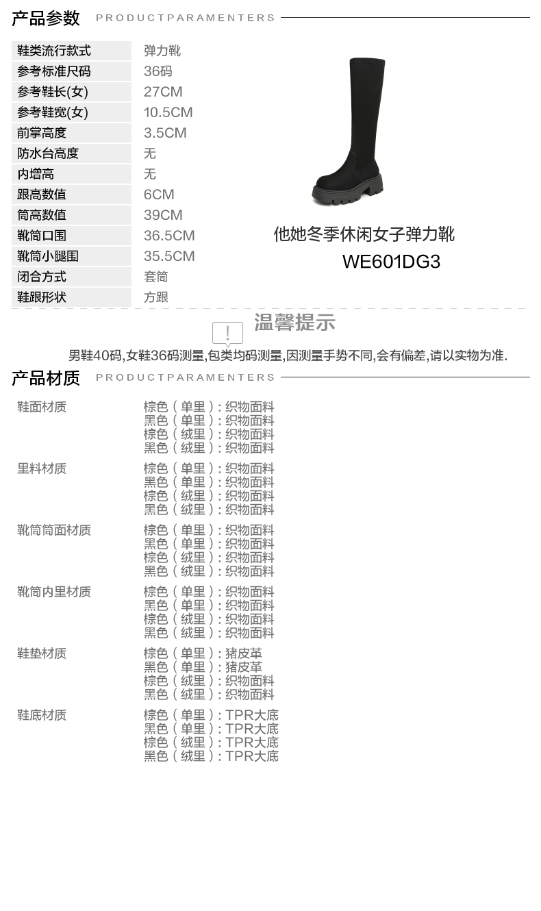 靴筒筒面材质:织物面料 靴筒小腿围:35.5CM 里料材质:织物面料 制鞋工艺:胶贴皮鞋 鞋垫材质:猪皮革