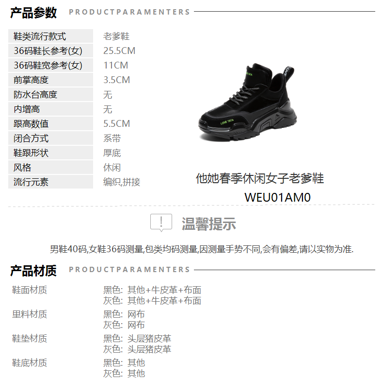 | 参考鞋长(女):25.5CM | 参考鞋宽(女):11CM | 风格:休闲 | 色系:黑色 | 参考标准尺码:36码 |