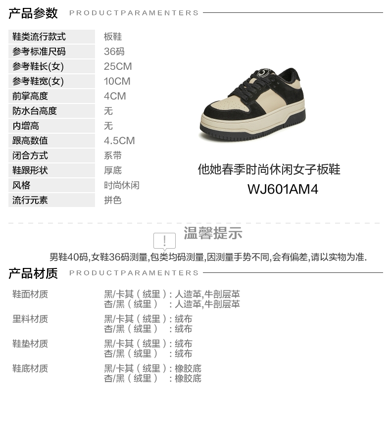 | 参考鞋长(女):25CM | 参考鞋宽(女):10CM | 风格:时尚休闲 | 色系:拼色 | 参考标准尺码:36码 |