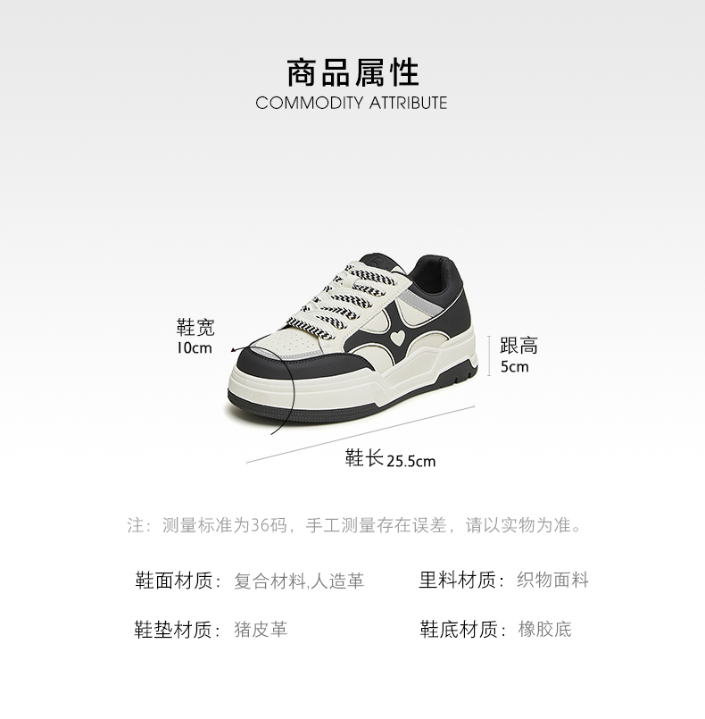 | 执行标准:舒适运动鞋Q/LR002-2023 | 跟高范围:中跟鞋(3-5CM) | 鞋面图案:拼色 | 鞋跟形状:厚底 | 厂家地址:广东省深圳市 |