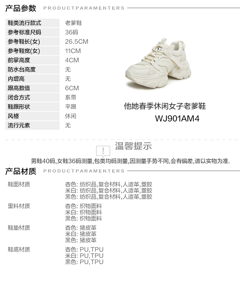 | 参考鞋宽(女):11CM | 风格:休闲 | 色系:米色 | 参考标准尺码:36码 | 跟高数值:6CM |