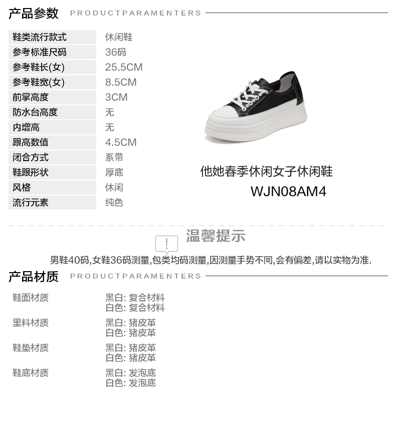 | 执行标准:休闲鞋 QB/T2955-2017 | 跟高范围:中跟鞋(3-5CM) | 鞋面图案:纯色 | 鞋跟形状:厚底 | 厂家地址:广东省深圳市 |