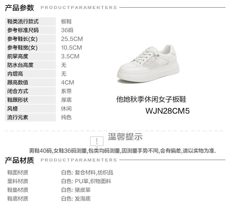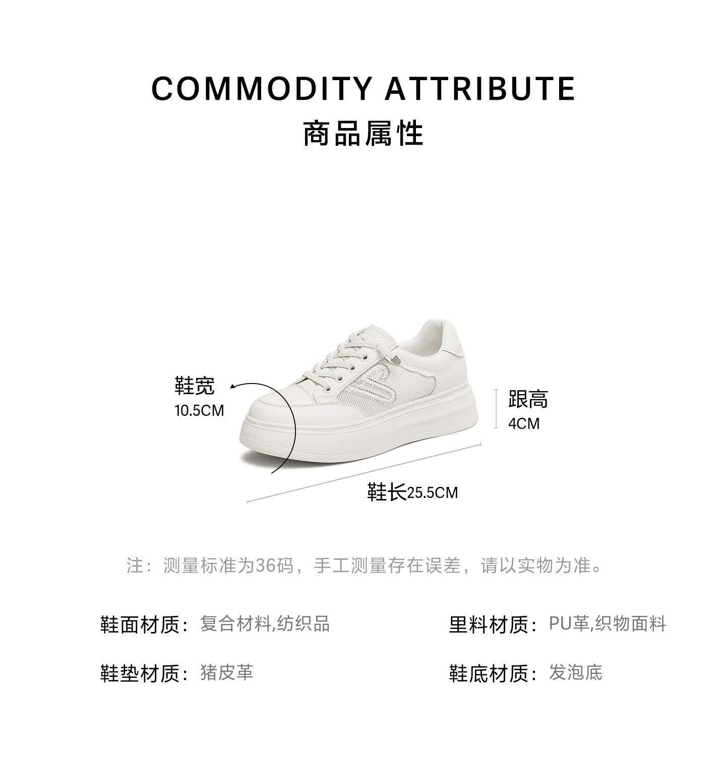| 闭合方式:系带 | 风格:休闲 | 跟高数值:4CM | 色系:白色 | 配跟:无 |