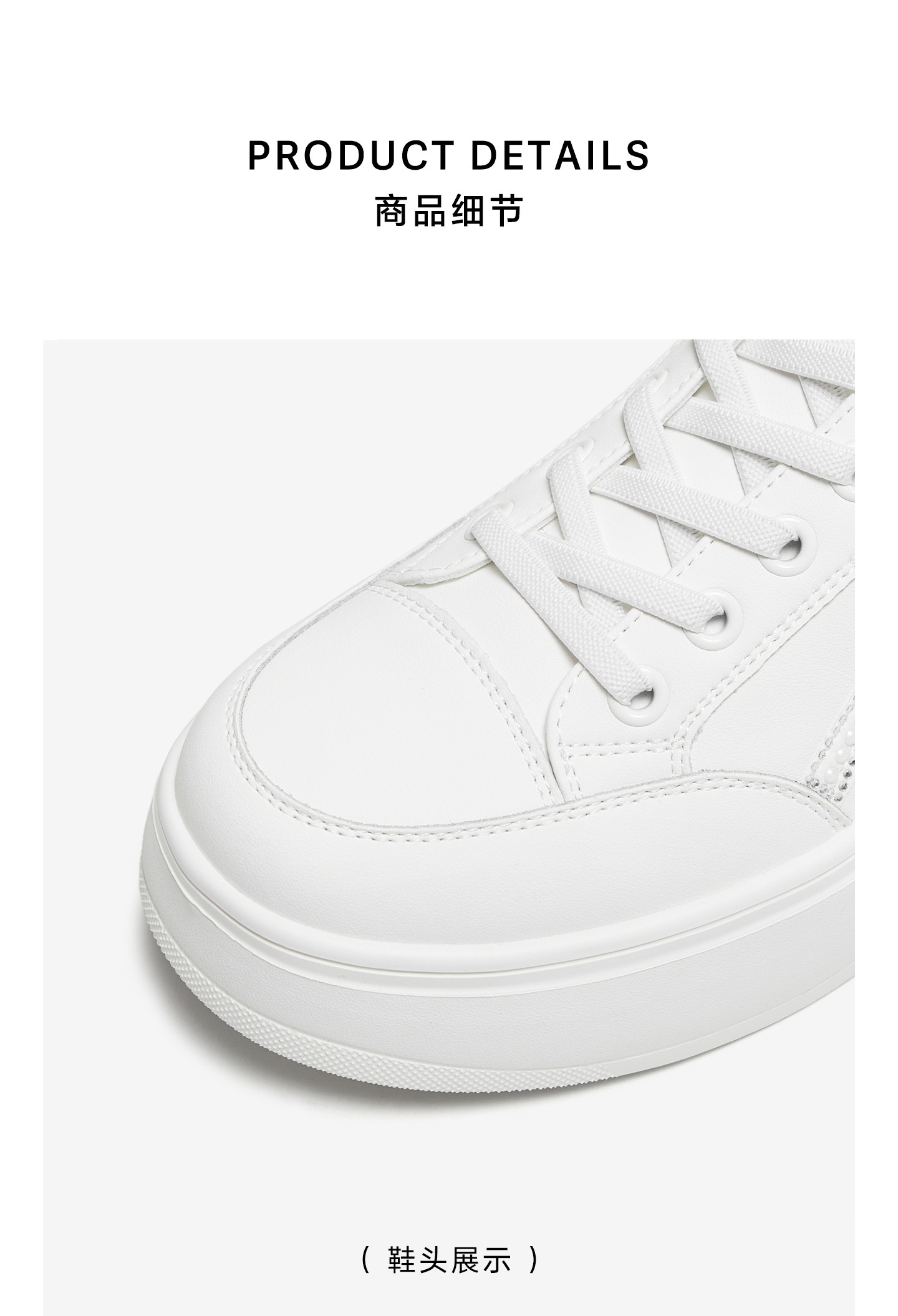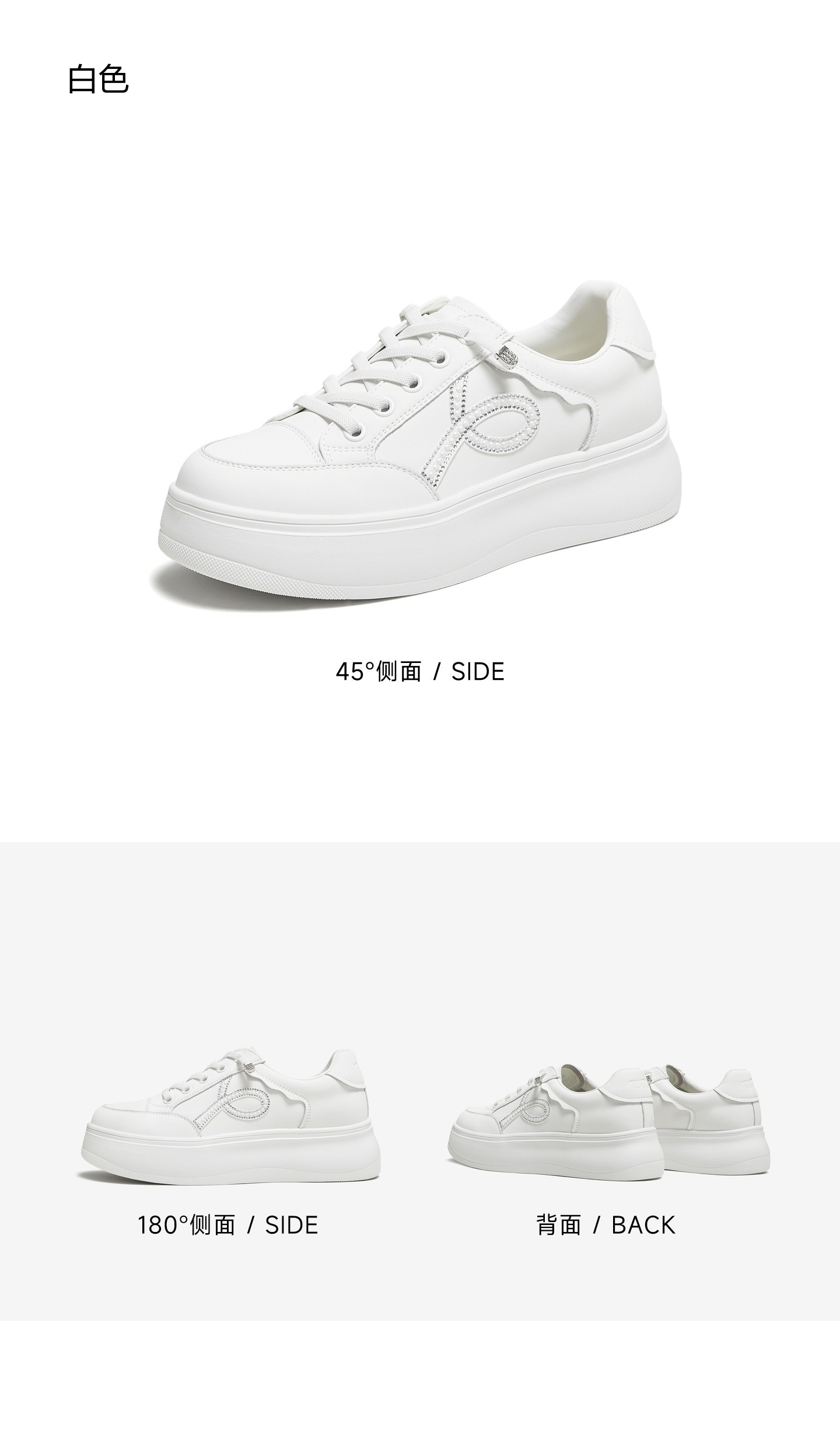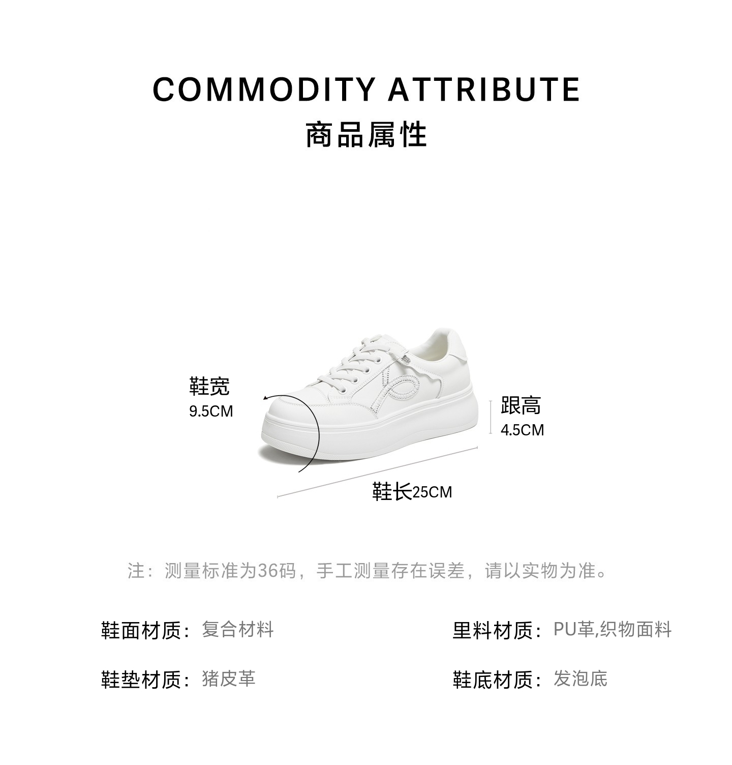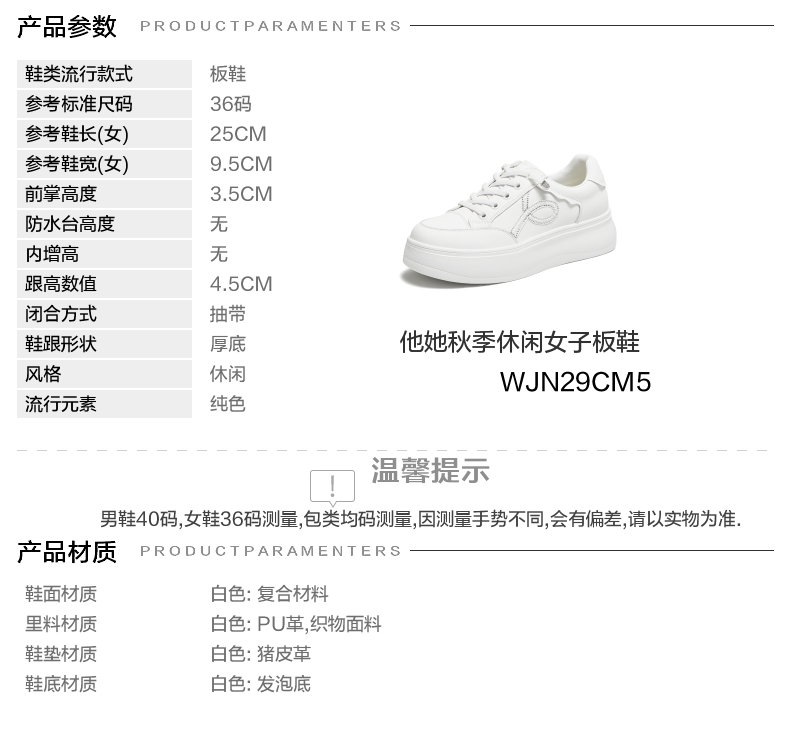 | 色系:白色 | 跟高数值:4.5CM | 性别:女子 | 里料材质:织物面料PU革 | 制鞋工艺:胶贴皮鞋 |
