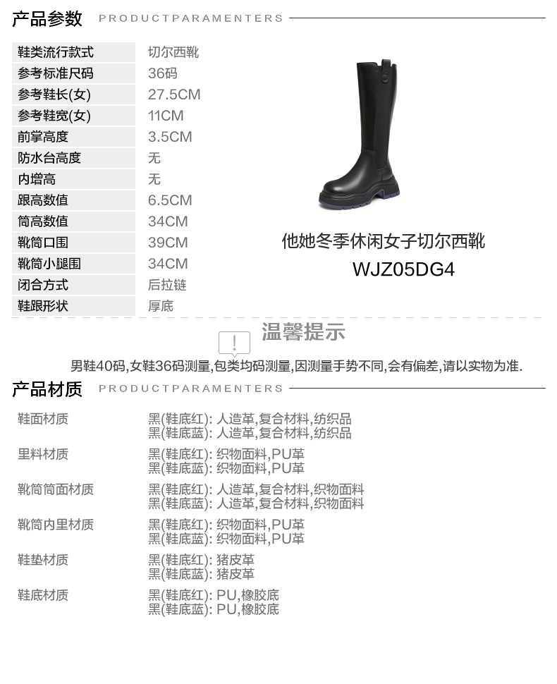 | 靴筒筒面材质:复合材料人造革织物面料 | 靴筒小腿围:34CM | 里料材质:PU革织物面料 | 制鞋工艺:胶贴皮鞋 | 款式季节:冬季 |