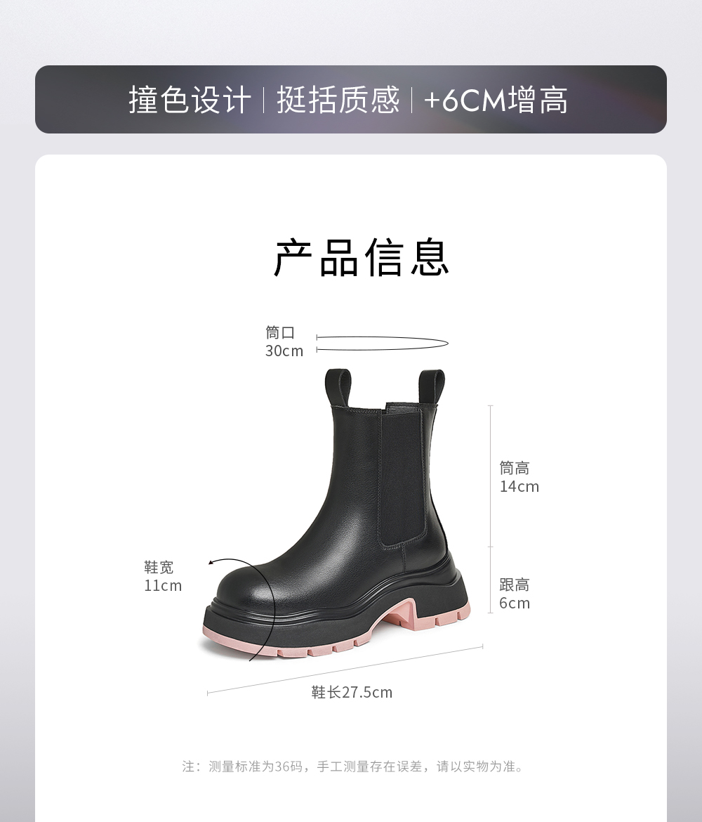 | 配跟:有 | 靴筒口围:30CM | 上市时间:2025年冬季 | 鞋类流行款式:切尔西靴 | 鞋头款式:圆头 |