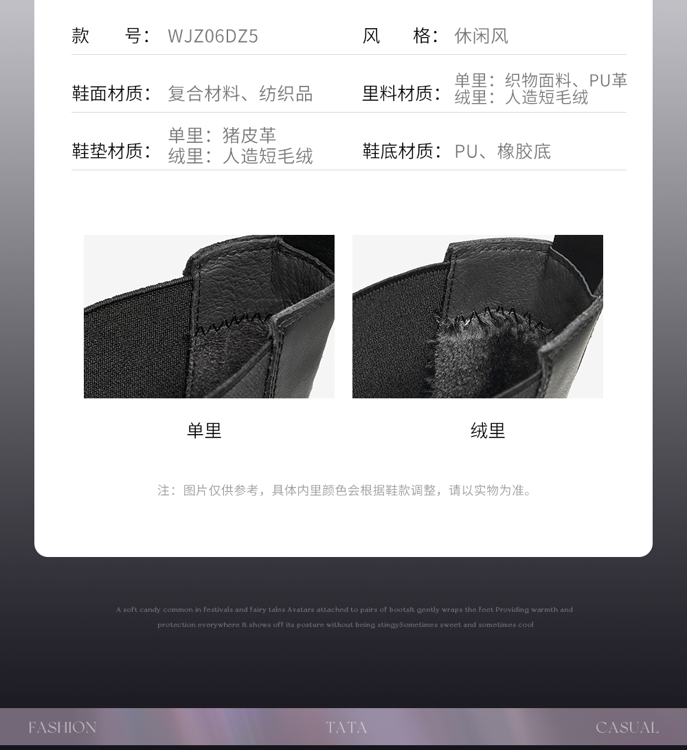 | 配跟:有 | 靴筒口围:30CM | 上市时间:2025年冬季 | 鞋类流行款式:切尔西靴 | 鞋头款式:圆头 |