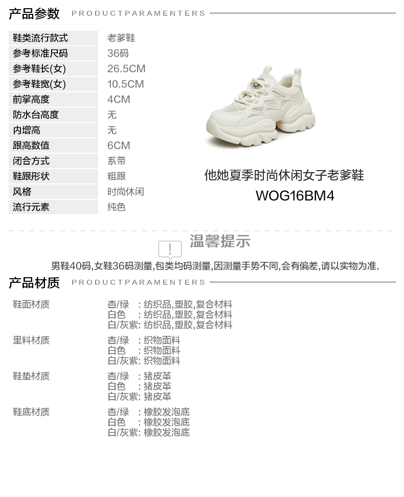 | 风格分类:老爹鞋 | 上市时间:2024年夏季 | 生产/经销/进口厂家:丽荣鞋业(深圳)有限公司 | 鞋类流行款式:老爹鞋 | 鞋头款式:圆头 |