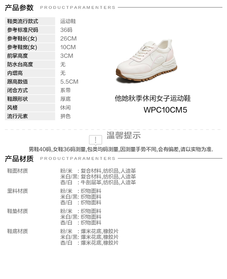 | 鞋跟形状:厚底 | 参考鞋长(女):26CM | 流行元素:拼色 | 参考鞋宽(女):10CM | 风格:休闲 |