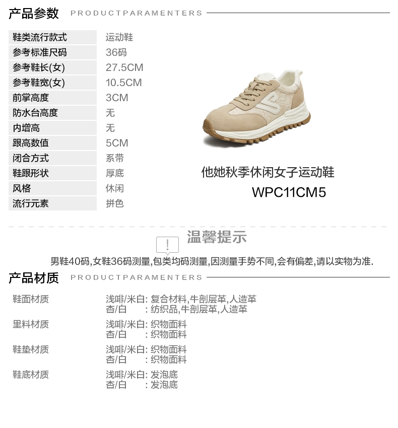 | 鞋跟形状:厚底 | 参考鞋长(女):27.5CM | 流行元素:拼色 | 参考鞋宽(女):10.5CM | 风格:休闲 |