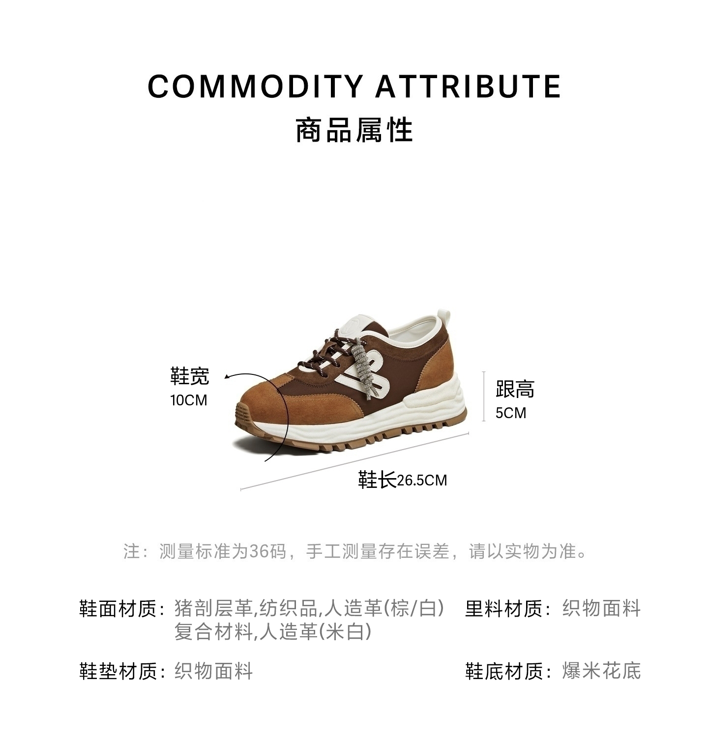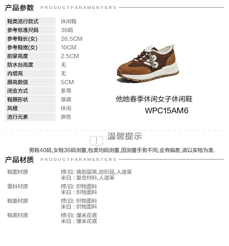 | 鞋跟形状:厚底 | 参考鞋长(女):26.5CM | 流行元素:拼色 | 参考鞋宽(女):10CM | 风格:休闲 |