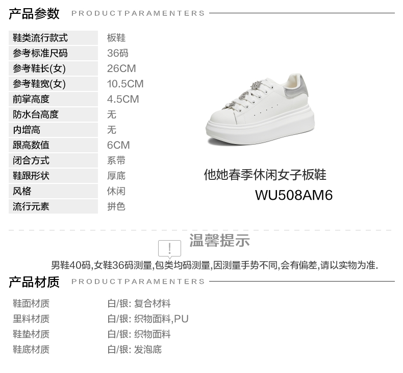 | 鞋跟形状:厚底 | 参考鞋长(女):26CM | 流行元素:拼色 | 参考鞋宽(女):10.5CM | 风格:休闲 |