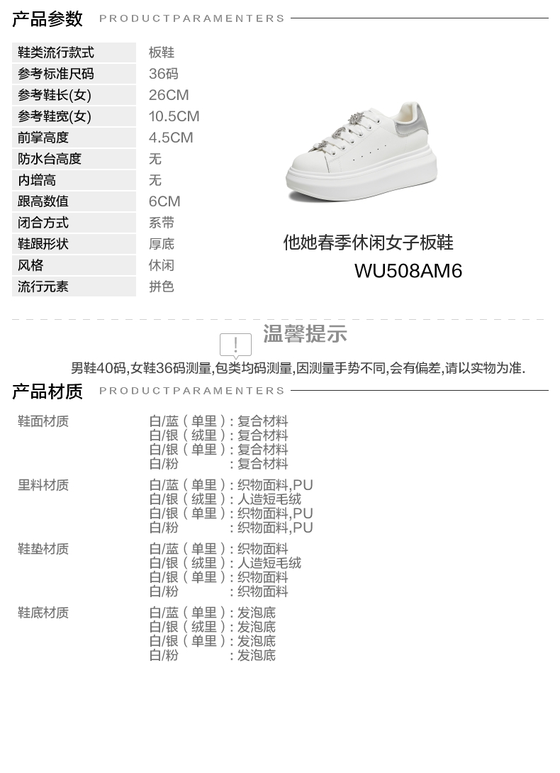 | 鞋跟形状:厚底 | 参考鞋长(女):26CM | 流行元素:拼色 | 参考鞋宽(女):10.5CM | 风格:休闲 |
