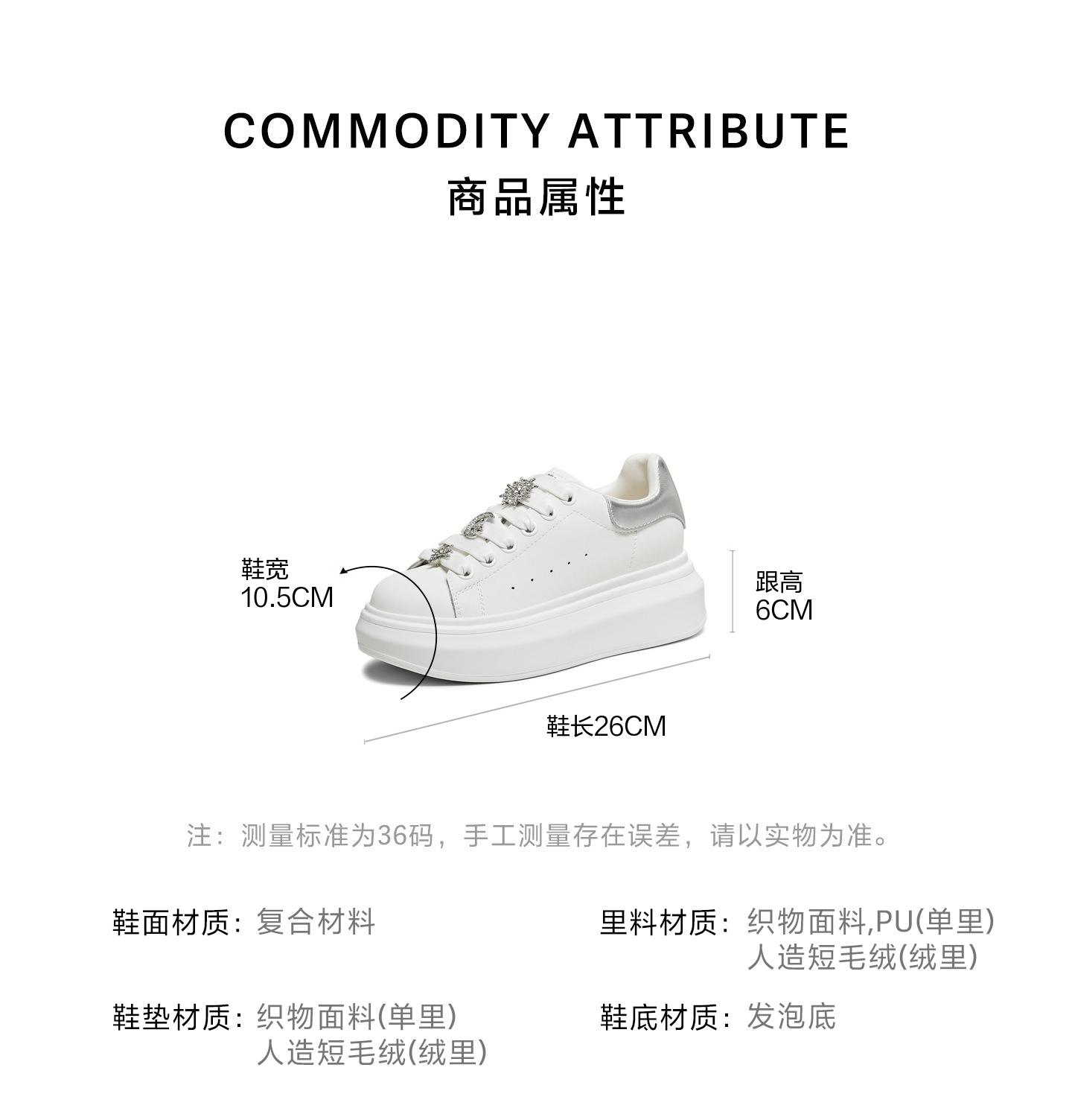 | 色系:白色 | 跟高数值:6CM | 适用人群:女子 | 性别:女子 | 里料材质:织物面料PU |