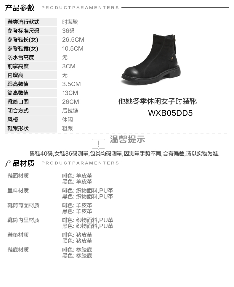 | 参考鞋宽(女):10.5CM | 风格:休闲 | 色系:黑色 | 跟高数值:3.5CM | 筒高数值:13CM |