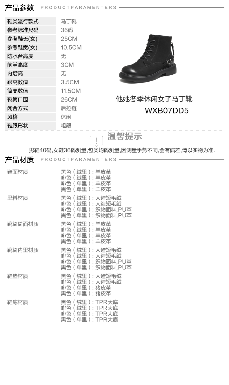 | 参考鞋宽(女):10.5CM | 风格:休闲 | 色系:黑色 | 跟高数值:3.5CM | 筒高数值:11.5CM |
