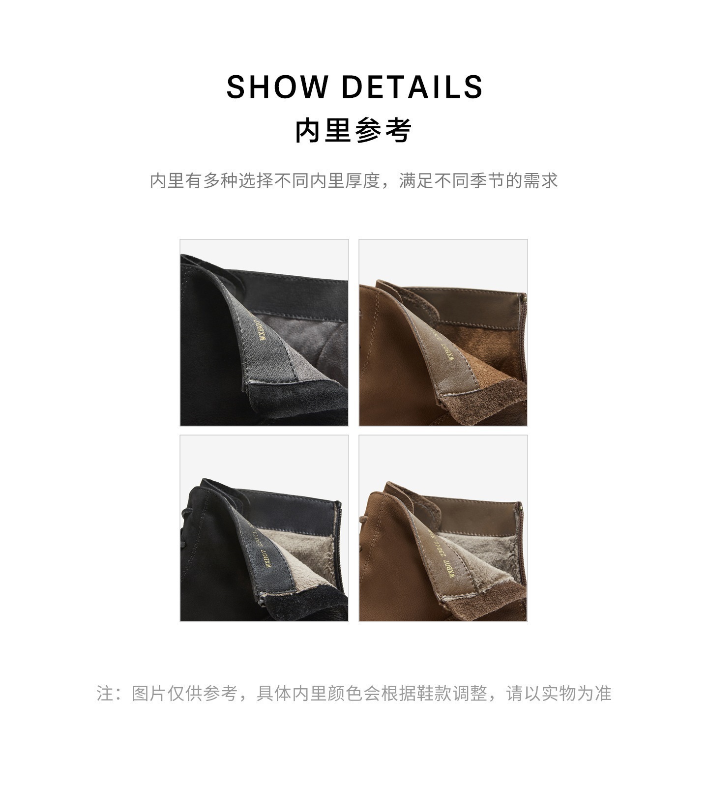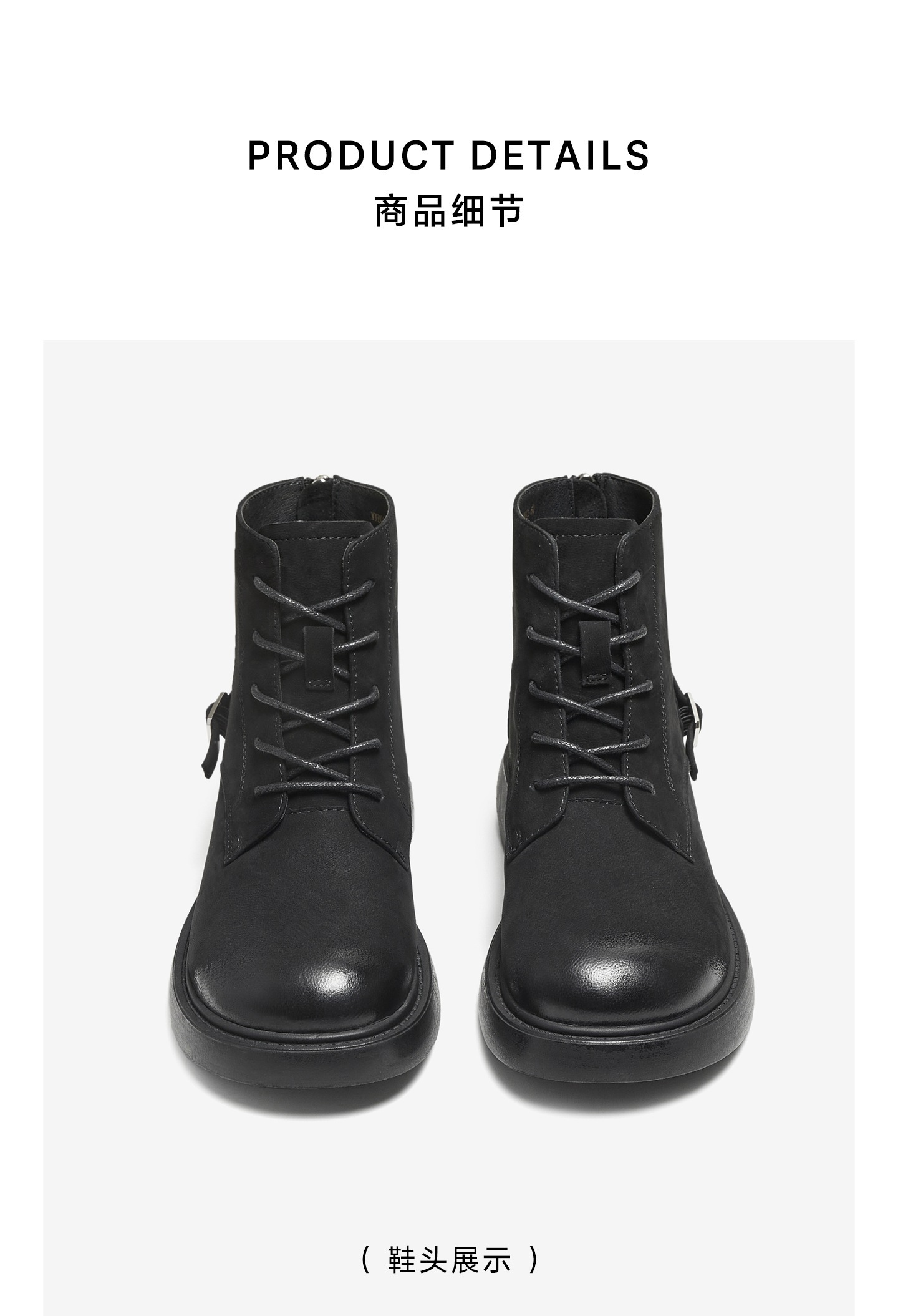 | 鞋底材质:TPR大底 | 靴筒内里材质:PU革织物面料 | 内增高:无 | 鞋面材质:羊皮革 | 闭合方式:后拉链 |