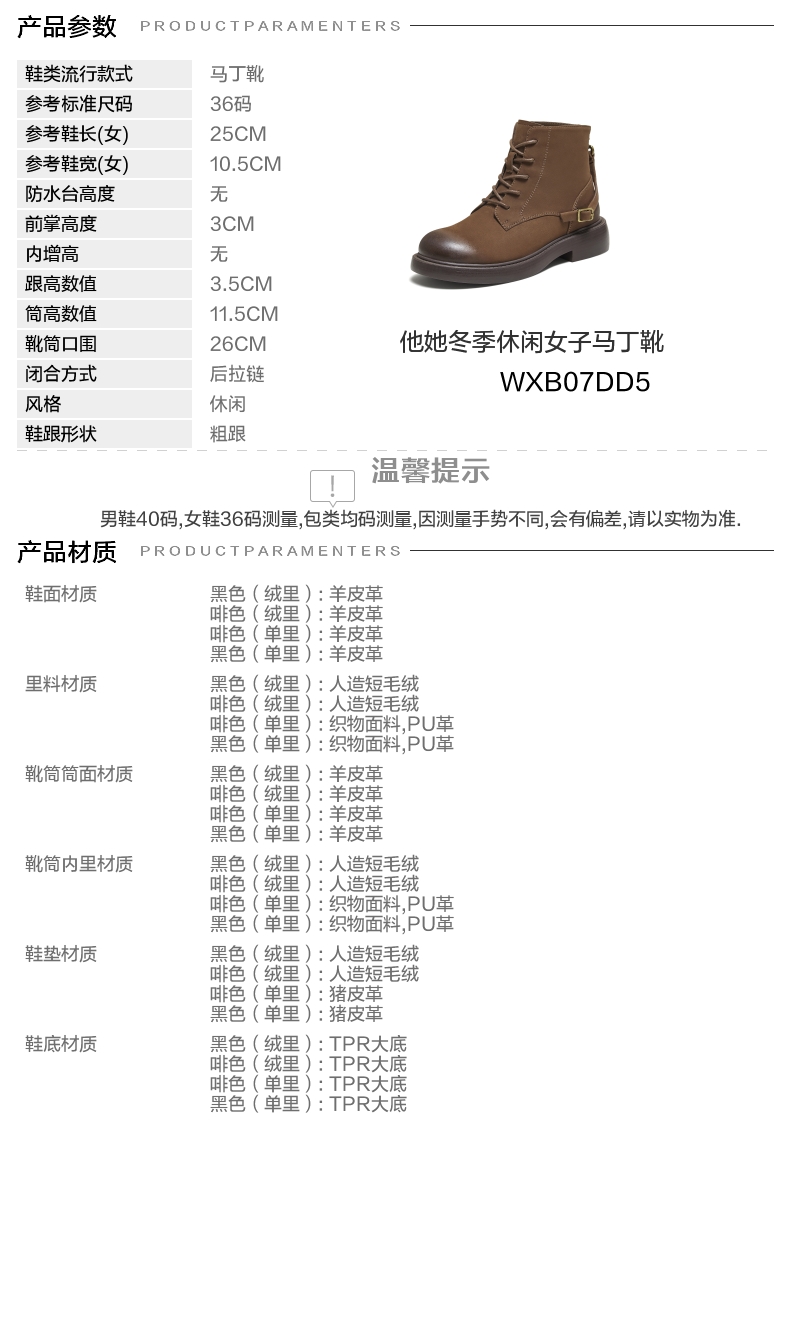 | 参考鞋宽(女):10.5CM | 风格:休闲 | 色系:咖啡色 | 跟高数值:3.5CM | 筒高数值:11.5CM |