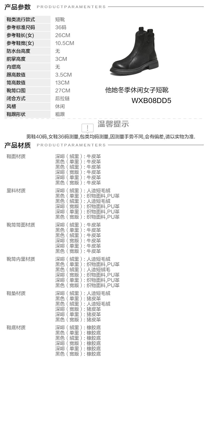 | 参考鞋宽(女):10.5CM | 风格:休闲 | 色系:黑色 | 跟高数值:3.5CM | 筒高数值:13CM |