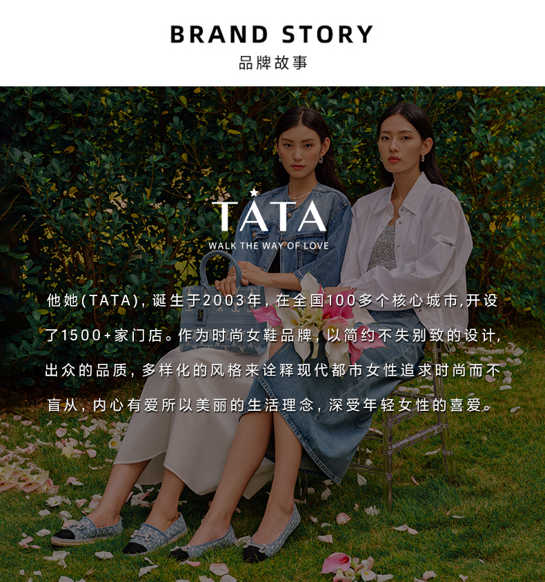 他她(Tata),品牌成立于2003年,致力为都市年轻人群提供时尚潮流、具有性价比的鞋履产品。十五年来“踏踏”的着地声,寓意都市白领元气满满的生活,如时尚“伴履”的TATA一直陪伴左右、伴随走出TATA的时尚步伐。2017年TATA美丽蜕变,TATA STAR元素的加入预示品牌将成为闪亮、前端的时尚鞋履品牌。