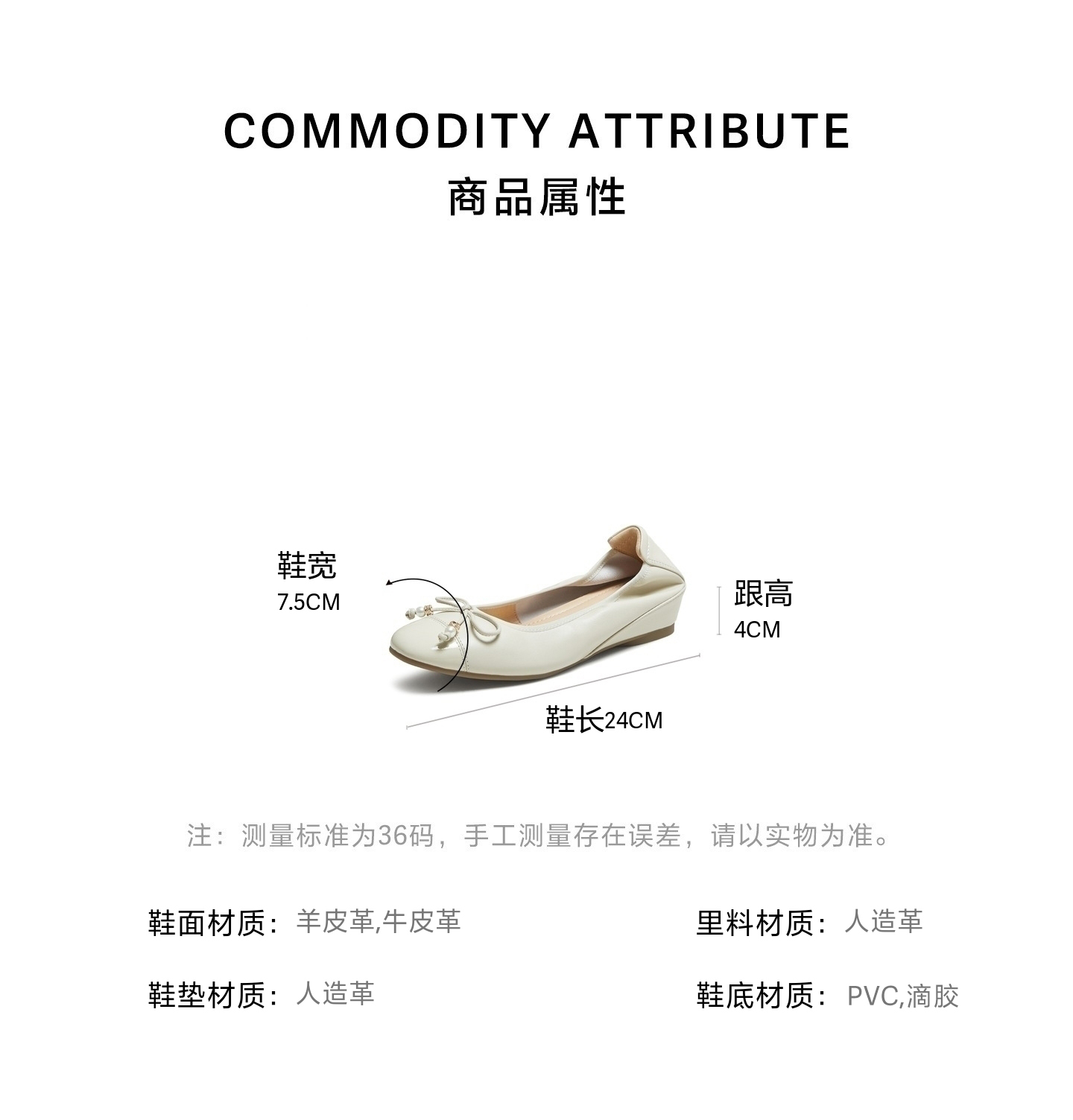 | 皮质特征:软面皮 | 前掌高度:0.5CM | 防水台高度:无 | 鞋类流行款式:浅口鞋 |