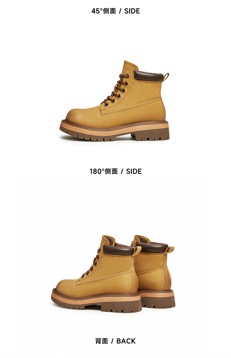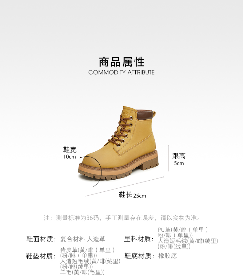 | 鞋底材质:橡胶底 | 靴筒内里材质:羊毛 | 内增高:无 | 鞋面材质:人造革复合材料 | 闭合方式:系带 |