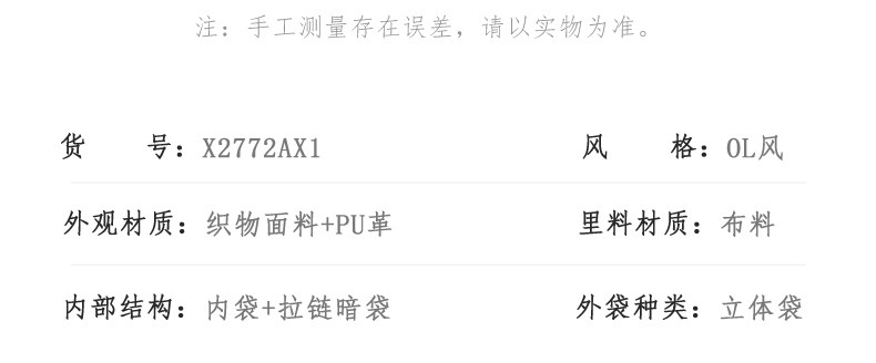 | 提拎部件类型:软把 | 手柄:有 | 可否折叠:否 | 闭合方式:暗扣 | 货品来源:自产 |