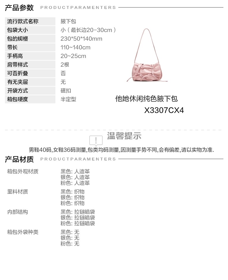 | 款式季节:秋季 | 材质工艺:软面皮 | 皮质特征:人造革 | 箱包硬度:半定型 | 箱包外观材质:人造革 |