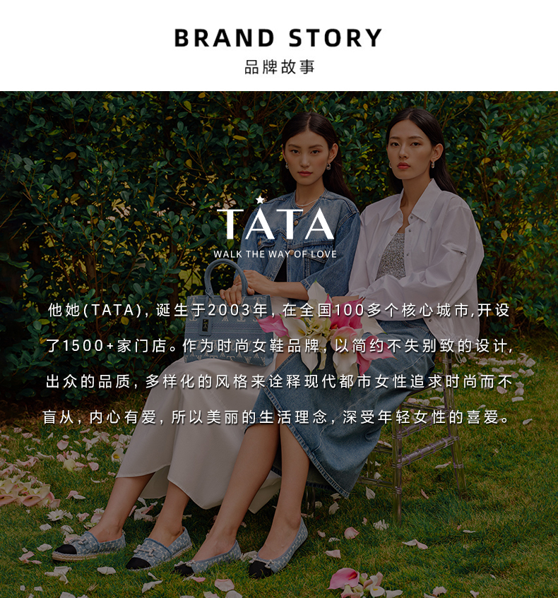 他她(Tata),品牌成立于2003年,致力为都市年轻人群提供时尚潮流、具有性价比的鞋履产品。十五年来“踏踏”的着地声,寓意都市白领元气满满的生活,如时尚“伴履”的TATA一直陪伴左右、伴随走出TATA的时尚步伐。2017年TATA美丽蜕变,TATA STAR元素的加入预示品牌将成为闪亮、前端的时尚鞋履品牌。