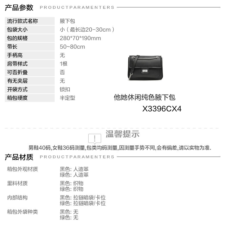 | 图案:纯色 | 执行标准:时尚背提包Q/LR 003-2021 | 带长:50~80cm | 箱包外形:横款方形 | 厂家地址:广东省深圳市 |