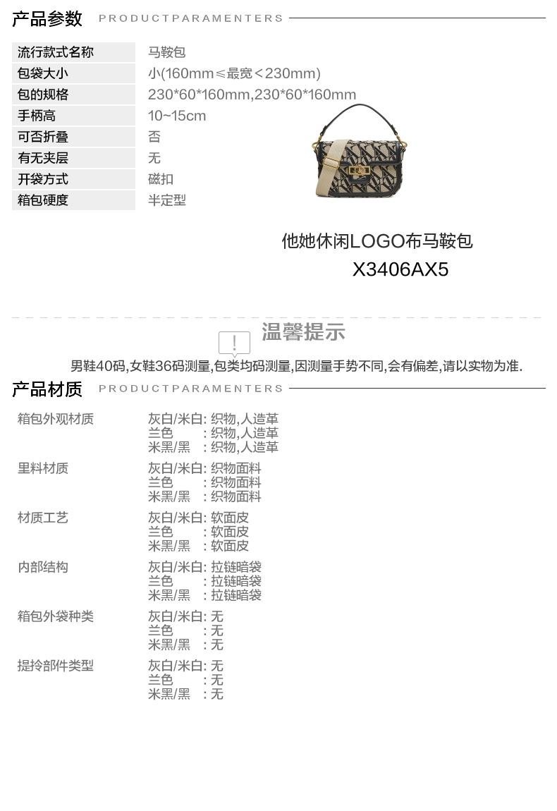 | 流行款式名称:马鞍包 | 开袋方式:磁扣 | 性别:女 | 里料材质:织物面料 | 手柄高:10~15cm |