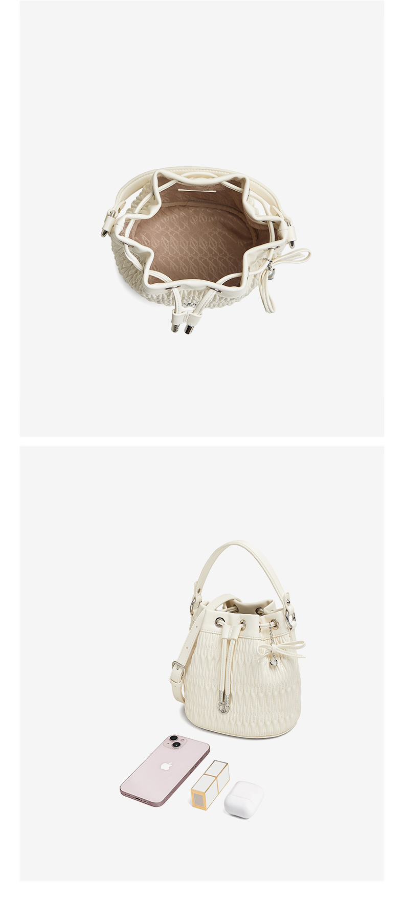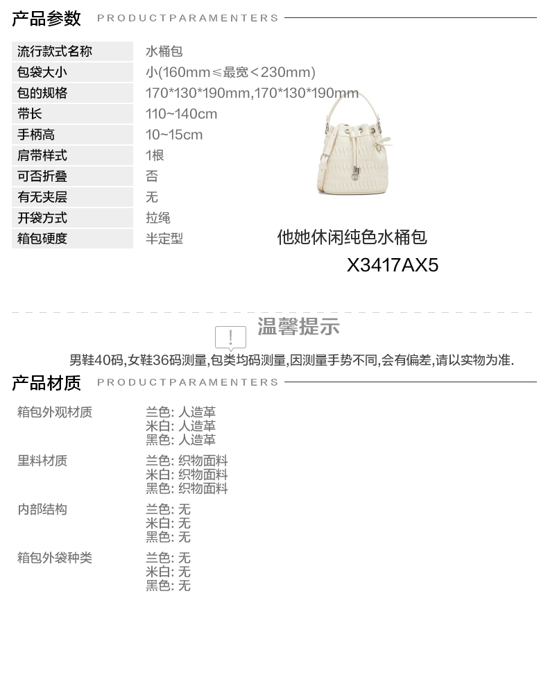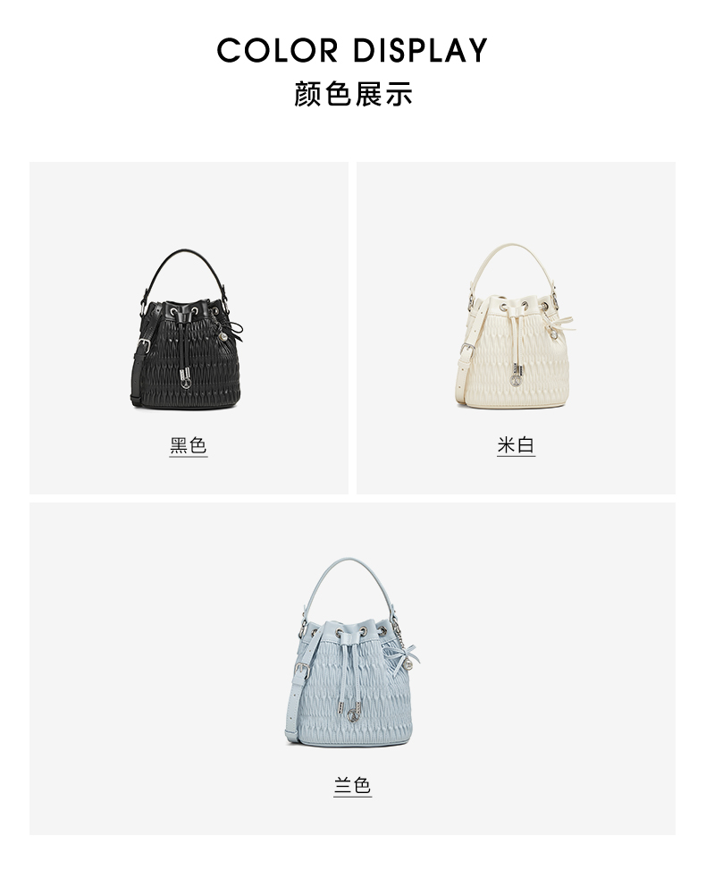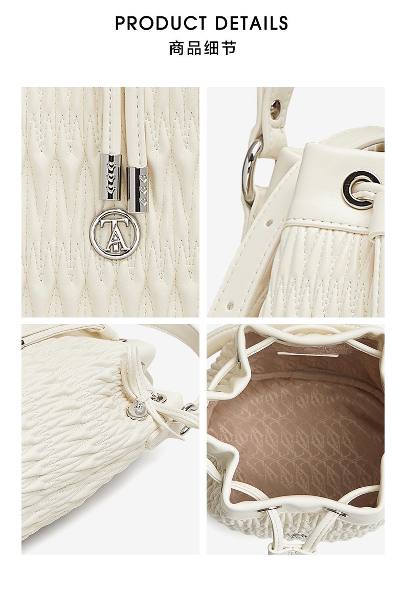 | 年份:2025年 | 色系:白色 | 适用场景:休闲 | 流行款式名称:水桶包 | 开袋方式:拉绳 |