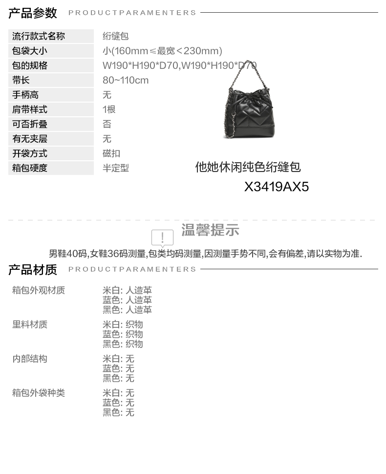 | 年份:2025年 | 色系:黑色 | 适用场景:休闲 | 流行款式名称:绗缝包 | 开袋方式:磁扣 |