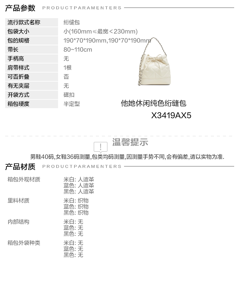 | 年份:2025年 | 色系:米白 | 适用场景:休闲 | 流行款式名称:绗缝包 | 开袋方式:磁扣 |