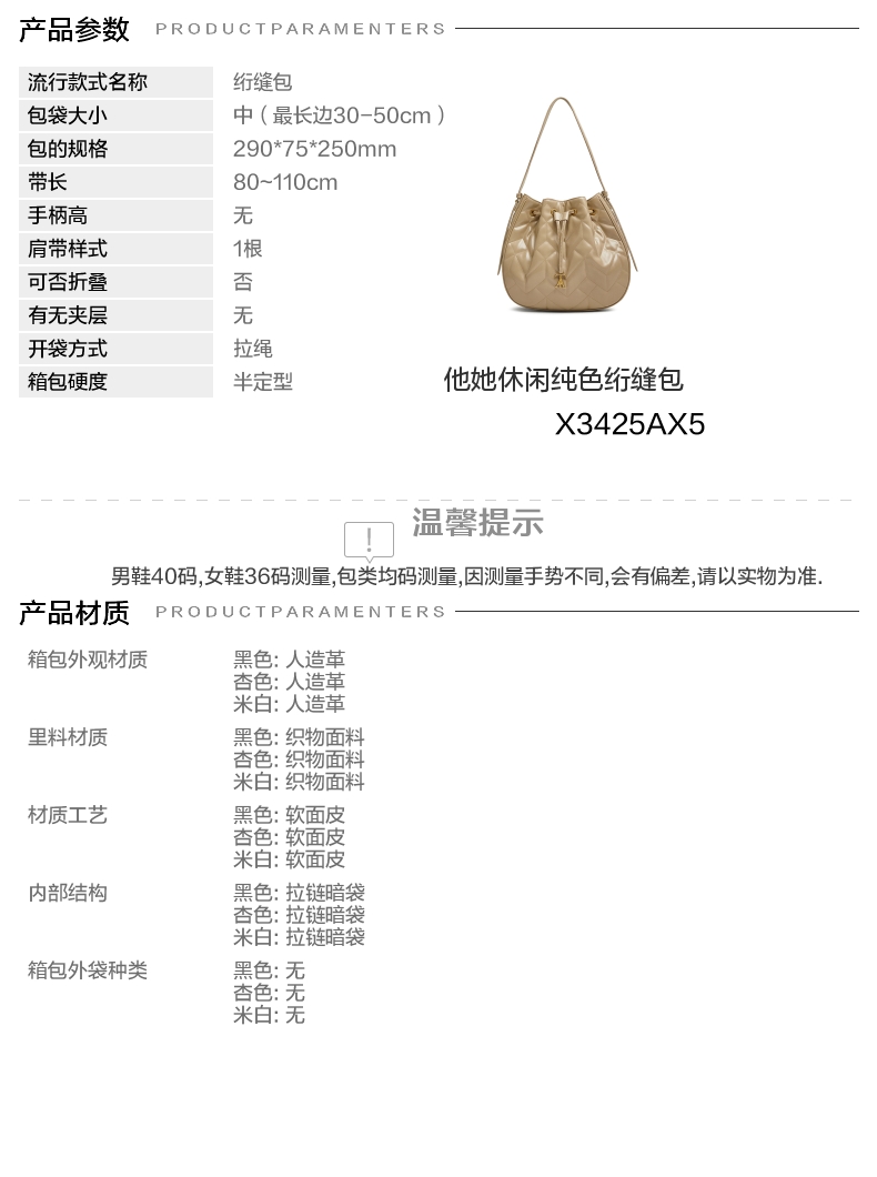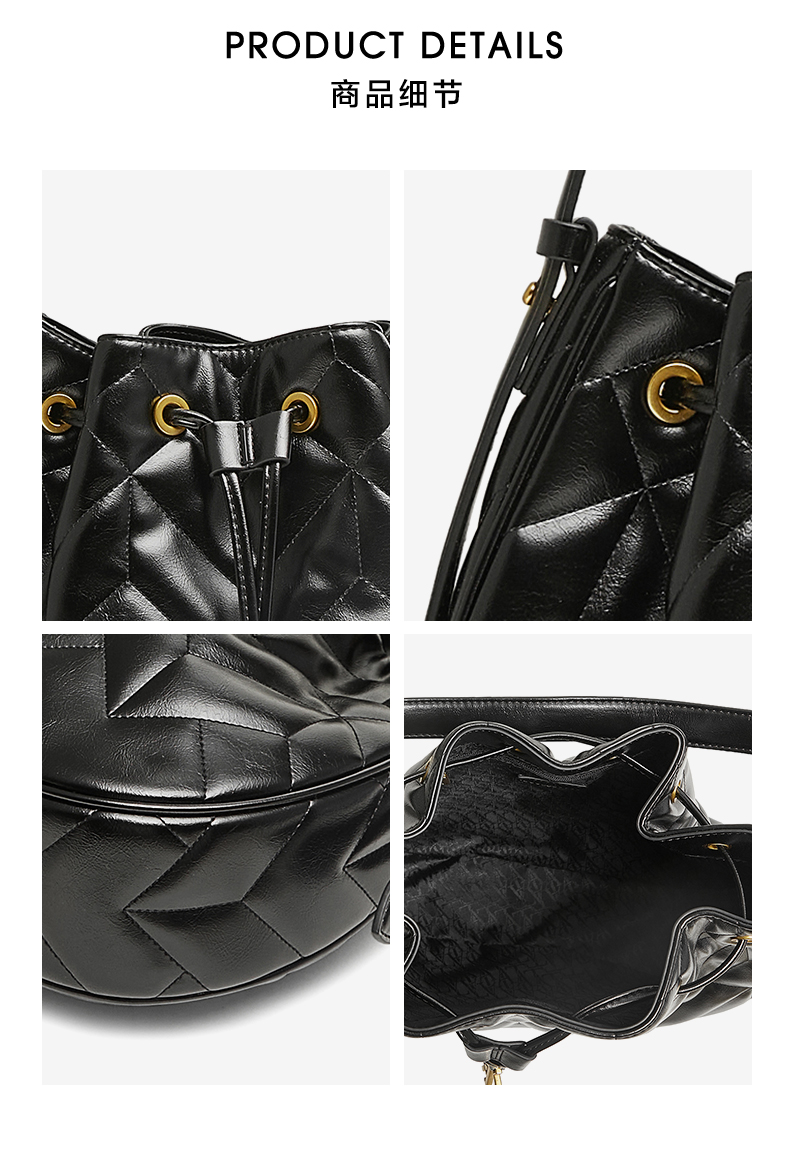 | 适用场景:休闲 | 流行款式名称:绗缝包 | 开袋方式:拉绳 | 性别:女子 | 里料材质:织物面料 |