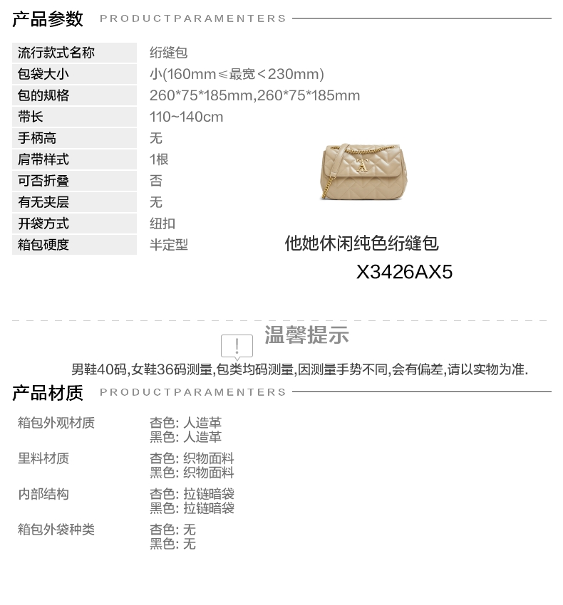 | 年份:2025年 | 色系:杏色 | 适用场景:休闲 | 流行款式名称:绗缝包 | 开袋方式:纽扣 |