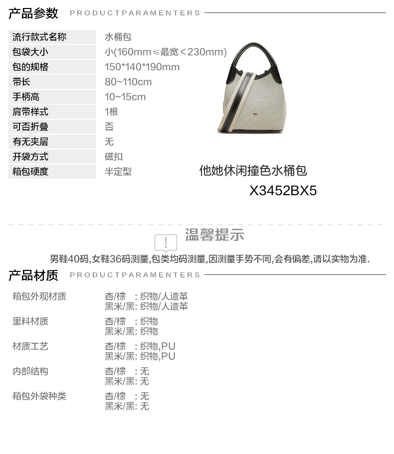 | 肩带样式:1根 | 手柄:有 | 带长:80~110cm | 流行元素:撞色 | 可否折叠:否 |