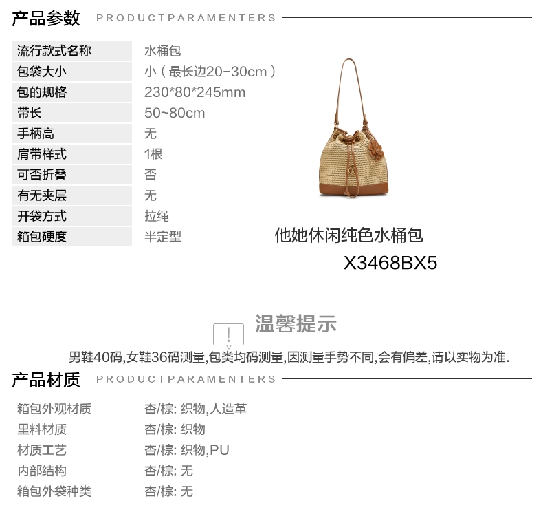 | 包的规格:230*80*245mm | 闭合方式:抽带 | 背带方式:手提/单肩 | 内部结构:无 | 风格:休闲 |