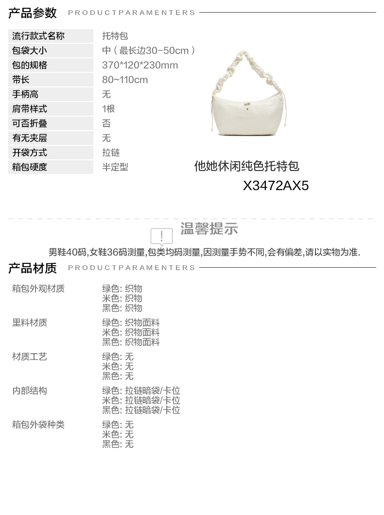 | 适用场景:休闲 | 流行款式名称:托特包 | 开袋方式:拉链 | 性别:女子 | 里料材质:织物面料 |
