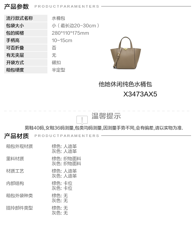 | 流行款式名称:水桶包 | 开袋方式:磁扣 | 性别:女 | 里料材质:织物面料 | 手柄高:10~15cm |