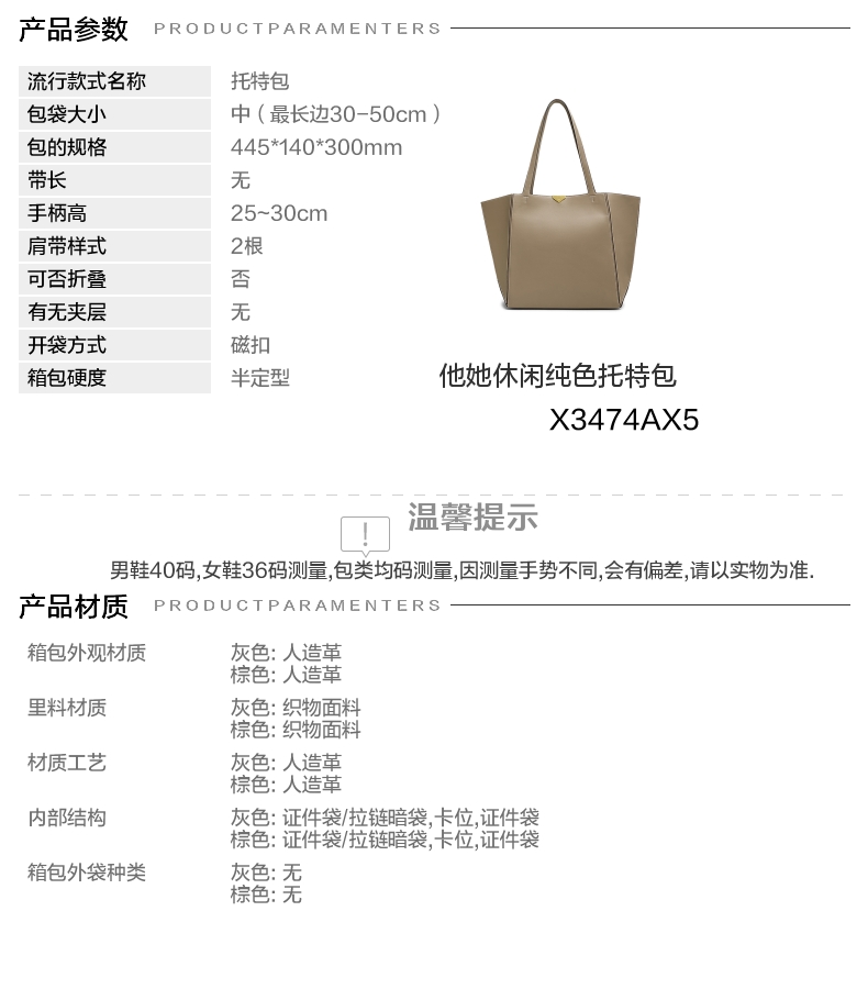 | 流行款式名称:托特包 | 开袋方式:磁扣 | 性别:女 | 里料材质:织物面料 | 手柄高:25~30cm |