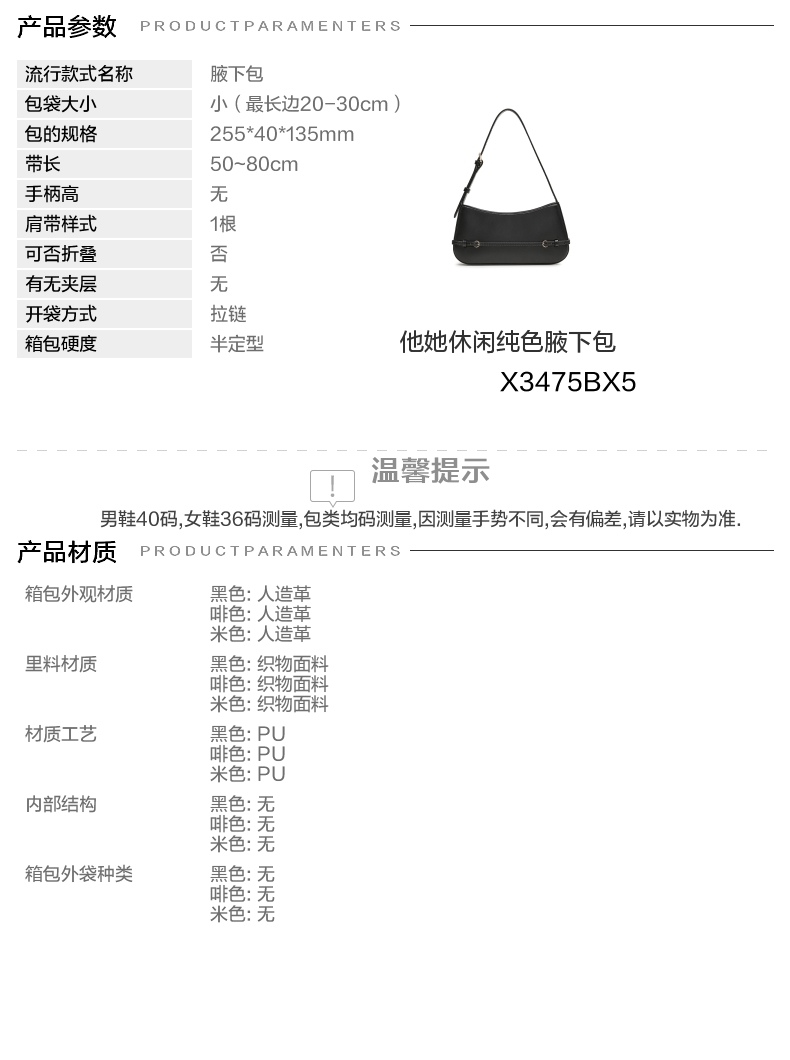 | 包的规格:255*40*135mm | 闭合方式:拉链 | 背带方式:手提/单肩 | 内部结构:无 | 风格:休闲 |
