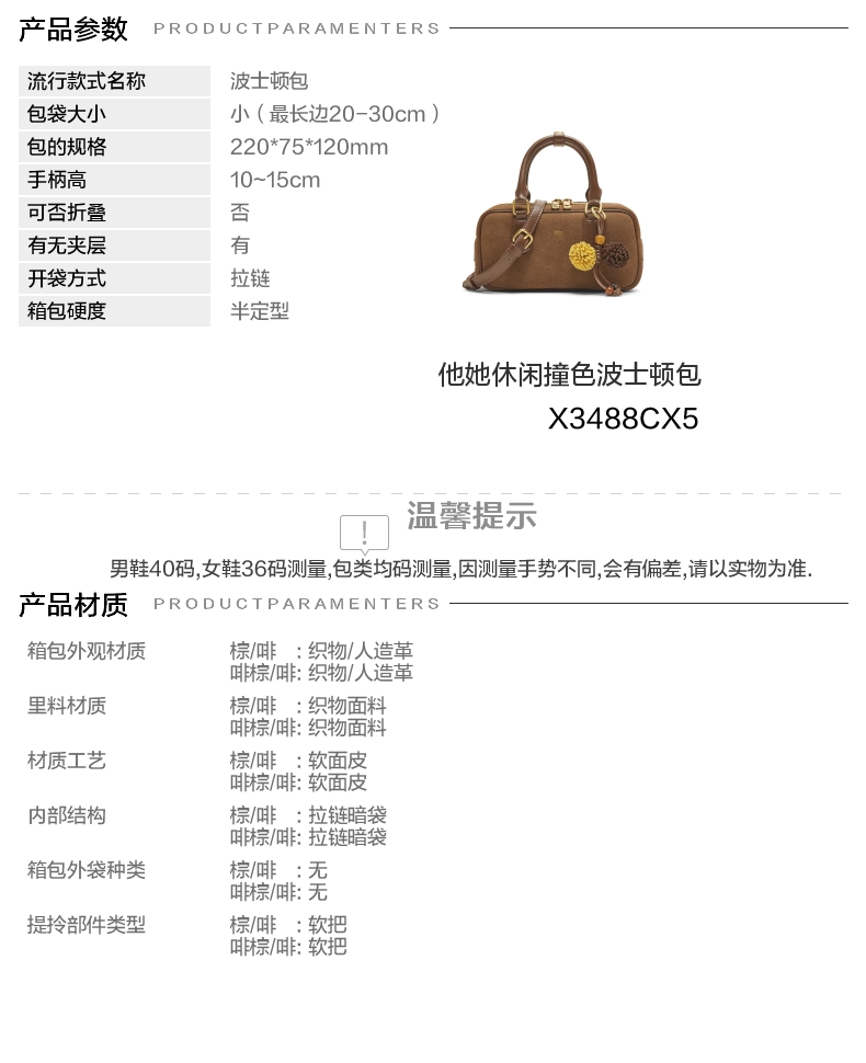 | 开袋方式:拉链 | 性别:女子 | 是否防水:否 | 里料材质:织物面料 | 手柄高:10~15cm |