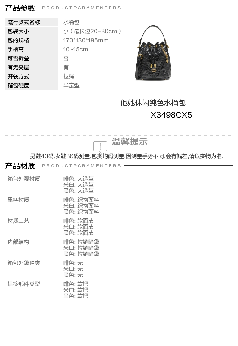 | 开袋方式:拉绳 | 性别:女子 | 是否防水:否 | 里料材质:织物面料 | 手柄高:10~15cm |